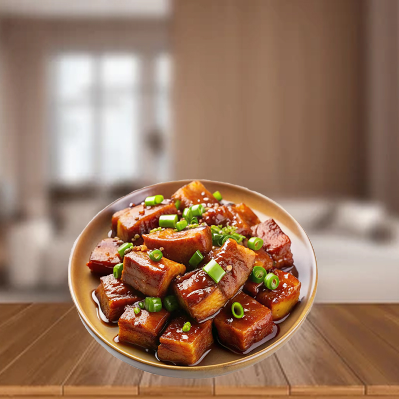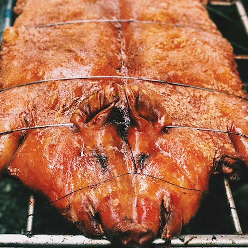 Delicioso chicharrón crujiente cocinado lentamente en caja china, una técnica tradicional que permite lograr una piel perfectamente dorada y crocante, con carne jugosa y llena de sabor. Se utiliza panceta de cerdo (barriga), sazonada con especias al gusto y marinada previamente para potenciar su sabor.